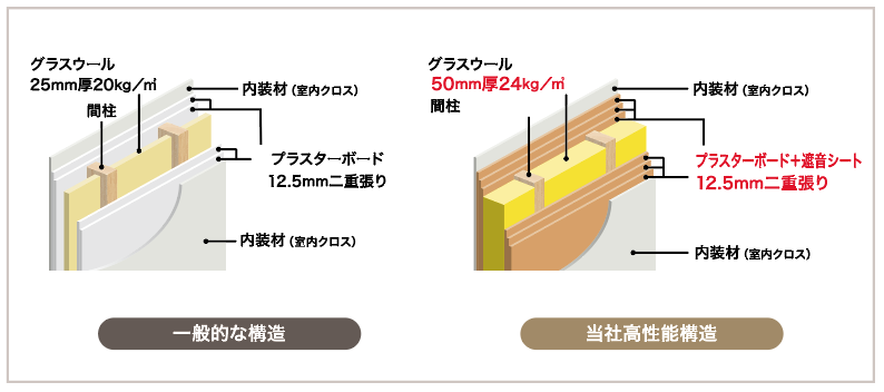 お隣との界壁にグラスウール断熱材(100mm厚さ24kg/㎡)を採用。お互いの音を軽減することにより、プライバシーを守り、トラブルのない生活環境を実現します。また、耐火性・耐久性に優れた構造を実現しました。