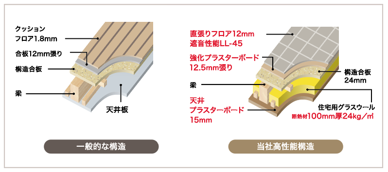 階下に足音などが響きにくい構造を採用。遮音性能に優れたフロアを実現。さらに、天井ボードを重ね貼りすることで高い防音性能を発揮し、上下階の音を低減します。
